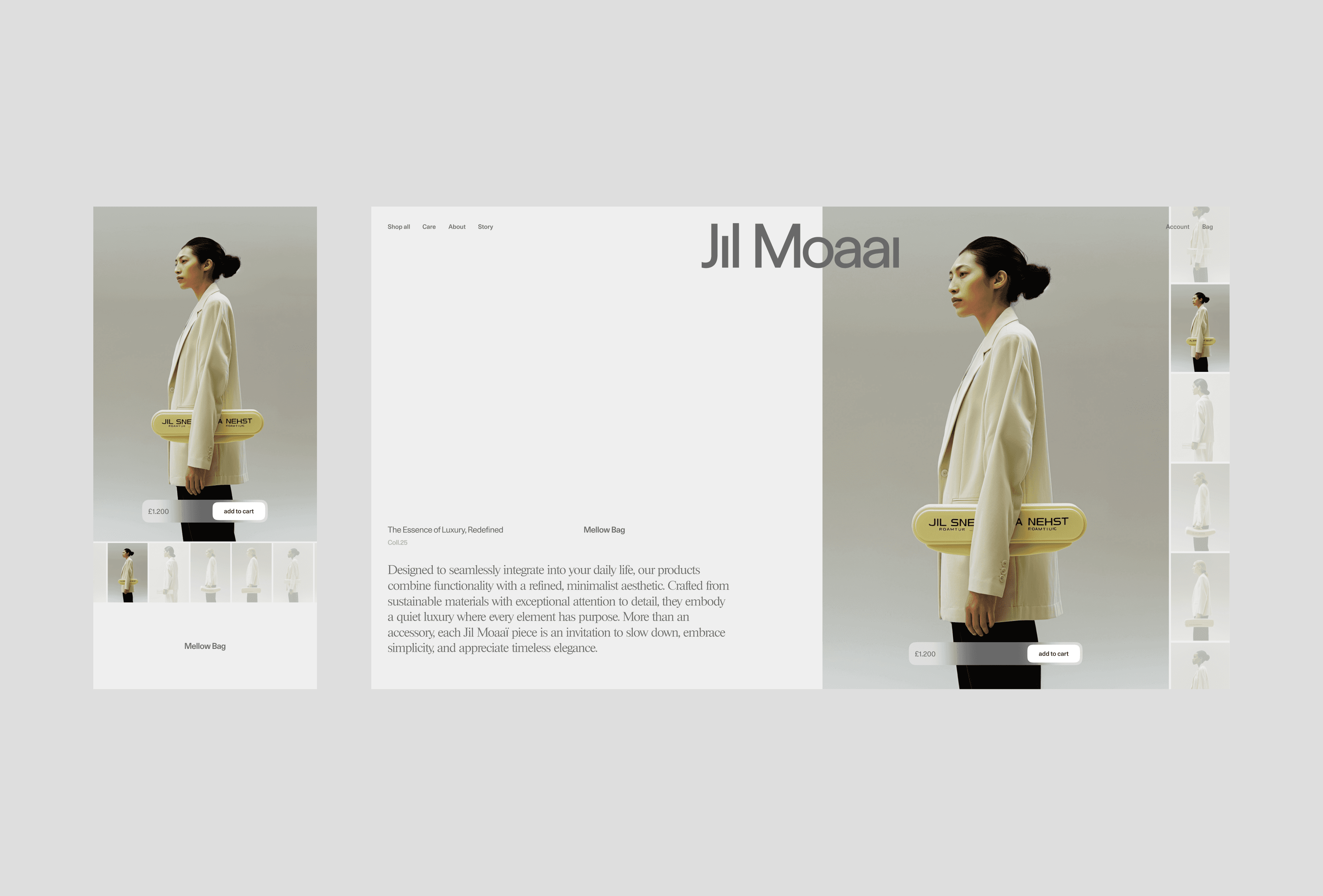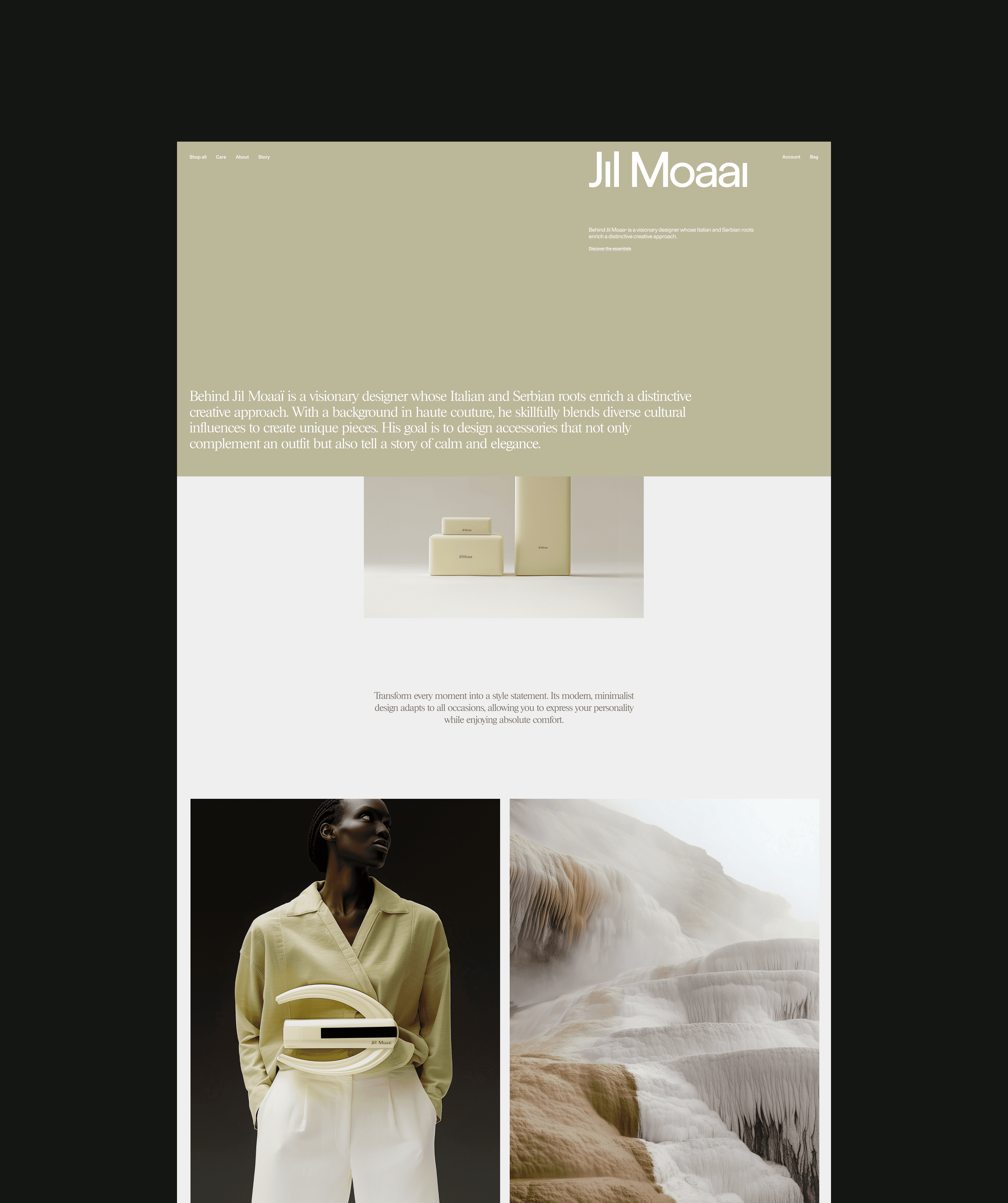 Jil Moaai reinvents luxury with minimalist, functional, and eco-friendly creations. Every detail, from design to the website, embodies responsible and timeless luxury. Jil Moaai is the result of a personal vision, a brand built entirely from scratch. This project represents the development of a unique concept that reinvents luxury through a minimalist, sustainable, and ethical approach. From the visual identity to the website design, including the creation of photos, texts, and strategic communication choices, every element has been crafted to embody perfect coherence with the project's vision.